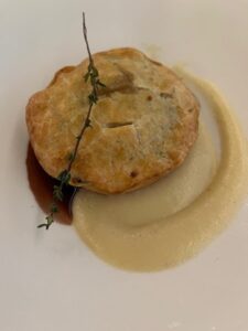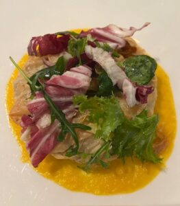 In Algeria, the chef’s Destination Menu offered a Chicken Bastilla, an Algerian pot pie with chicken, almonds, raisins and wonderful Algerian spices. The pie, which has a sturdy top crust, is hidden under an artistic arrangement of radicchio and greens.