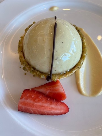 Dessert on board the ship that night was a Hazelnut Bavarois (Bavarian Crème Pie) with Banana Sorbet which we enjoyed as we cruised along the Provencal Coast East of Marseille.