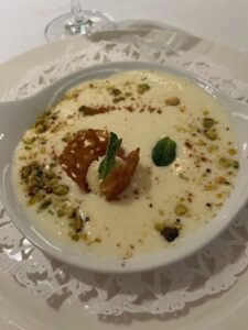 Tonight, the chef prepared a lamb pot pie perched on mashed potatoes and garnished with a spicy herb meat sauce. For dessert, to calm my tastebuds, I chose Mhalbi, a creamy cinnamon and rice “pie” with a caramelized pistachio topping.