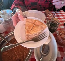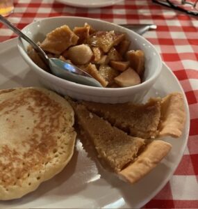 The meal started when the server placed a bottle of maple syrup on the table. In case you are not up to date on your taste buds, there are now five flavors our buds can respond to: sweet, sour, salty, bitter, and umami (savory). Maple syrup activates umami, and we were instructed to pour the maple syrup on every item that we would be served, including the first course of pea soup, the next course, baked beans and a meat pie, and the final courses of sausages, potatoes, pancakes, pancake pieces with diced apples drizzled with syrup and a maple syrup pie.