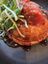 a boreal (from the forest) meat pie made from ground elk, bison, pig, or deer, and of course a dessert pie, with maple syrup as the featured ingredient. In the photos you will notice a dollop of “ketchup” served on the side or on top of the pie along with field greens. Ketchup in Quebec is a sweet tomato relish made from diced tomatoes and seasoned with vinegar, salt, onion and other spices and provides a nice contrast to the meat pie. During the “season” the pie might rest on a drizzle of maple syrup!