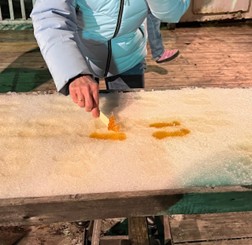 But wait…. we had not yet had enough maple syrup. As we were leaving, we were directed to a snow-covered table with rectangular indentations into which our hosts had poured maple syrup. With our syrup sticks (tongue depressors) we scooped up the chilled syrup and, with our teeth, pulled the snow and sugar on to our tastebuds, thus completing the full Cabane au Sucre experience!